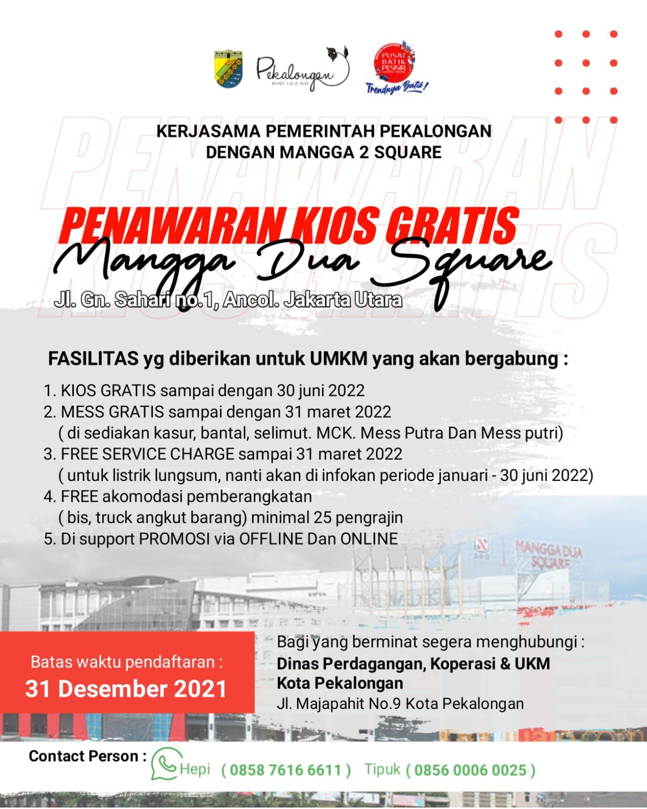 Barangkali ada yg berminat segera menghubungi atau datang langsung ke kantor DINDAGKOP & UKM Kota Pekalongan.